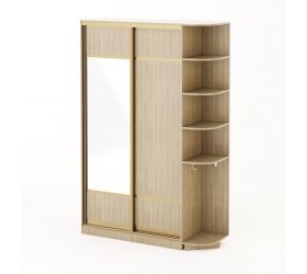 Имеет двери-купе, большое количество полок и пять выдвижных ящиков.